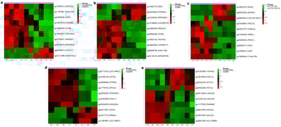 Heatmaps with the top 10 differentially methylated positions (DMPs) in some of the FTD comparisons performed. Each CpG obtained has its associated gene beside it. (a) Brain MAPT vs. CTRL; (b) brain GRN vs. CTRL; (c) brain sFTD-TDP43 vs. sFTD-Tau; (d) LCLs MAPT vs. CTRL; (e) LCLs GRN vs. CTRL. Abbreviations: CTRL, healthy controls; MAPT and GRN, familial frontotemporal dementia caused by mutation in MAPT or GRN genes; sFTD-Tau, sporadic frontotemporal dementia with tau deposits; sFTD-TDP43, sporadic frontotemporal dementia with TDP43 deposits; LCLs, lymphoblastoid cell lines.