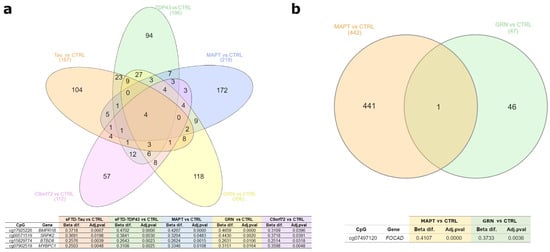 Common differentially methylated CpGs (DMPs) found between different comparisons in FTD. Venn diagrams showing common DMPs in brain (a) and LCL comparisons (b). The table underneath the Venn diagram (a) shows the common DMPs found and their correspondent genes, Beta differences (Beta dif.), and adjusted-p values (Adj.pval). Filters applied: in brain, adjusted-p value is < 0.05 and absolute value of Beta difference is >0.25; in LCLs, adjusted-p value is <0.01 and absolute value of Beta difference is >0.35. Abbreviations: CTRL, healthy controls; MAPT, GRN, and C9orf72, familial frontotemporal dementia caused by mutation in MAPT, GRN, or C9orf72 genes; sFTD-Tau, sporadic frontotemporal dementia with tau deposits; sFTD-TDP43, sporadic frontotemporal dementia with TDP43 deposits; LCLs, lymphoblastoid cell lines.