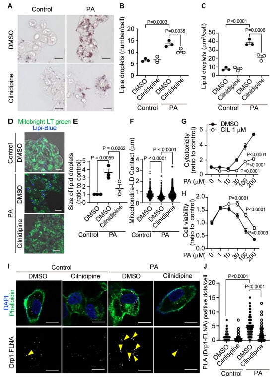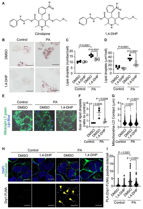 2.1. Treatment with Cilnidipine Reduced LDs Accompanied with Suppression of Palmitic Acid (PA)-Induced Drp1–FLNA Complex