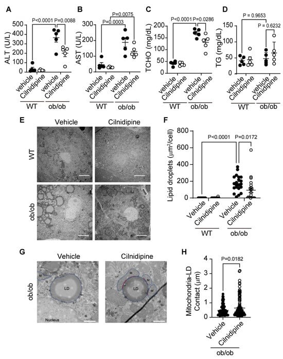 2.2. Treatment with Cilnidipine Improved Liver Injury and LDs in ob/ob Mice