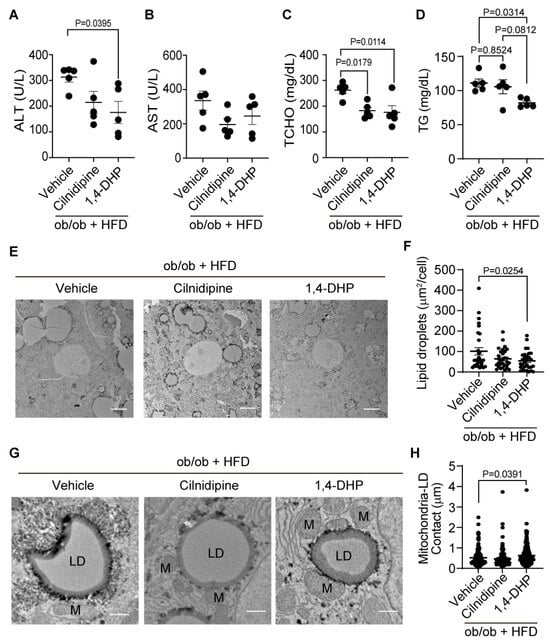 2.5. Treatment with 1,4-DHP Improved Liver Injury and LDs in ob/ob Mice Fed HFD
