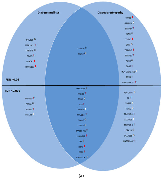 In the combined analysis of genes unique to DR and those in common with diabetes mellitus at the threshold of <0.05, we identified C2, C4A, CD8A, HLA-DRB5, and HLA-DQA2, which have been associated with lymphocyte-mediated immunity (FDR 2.96 × 10−2). Moreover, a total of 22 genes were found that are also associated with the immune system process: TRAV3, C2, TRAV17, TRBV6-1, TRBV18, TRAV2, TRAV12-1, TRAV12-2, TRAV23DV6, TRBV10-3, CD8A, C4A, HLA-DRB5, HLA-DQA2, TRAV27, TRAV8-1, AGER, BAG6, TRIM10, TRAV20, RIOK3, and TRVB2 (FDR 1.49 × 10−9). In addition to the previous ones, IER3, HSPA1B, JUNB, DCLRE1B, ADGRG1, TRBV15, and FLOT1 were identified, which have been found to be associated with immune response to stimulus (FDR 9.58 × 10−4). Reducing the threshold to <0.005, only TRAV3, C2, TRAV17, TRBV6-1, TRBV18, TRAV2, TRAV12-1, TRAV12-2, TRAV23DV6, TRBV10-3, CD8A, C4A, HLA-DRB5, and HLA-DQA2 were identified as being associated with adaptative immune response (FDR 1.20 × 10−11) and the immune system process (FDR 6.01 × 10−5). Finally, C2, C4A, HLA-DRB5, and HLA-DQA2 were identified as being associated with B-cell-mediated immunity (FDR 1.30 × 10−2). HLA-DQB1-AS1 and SAPCD1-AS1 could not be mapped in GO PANTHER.