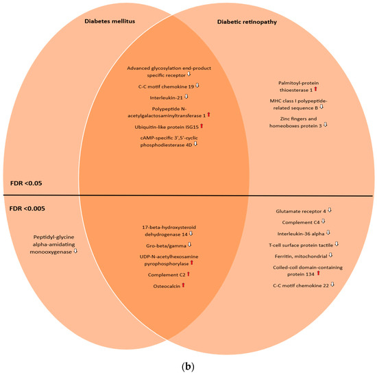 The genes and proteins were then divided by FDR-adjusted p-value (with two different thresholds (<0.05 and <0.005)) and into three groups: those uniquely associated with diabetic retinopathy, those uniquely associated with diabetes mellitus, and the ones in common between these two conditions. A total of 23 genes and 10 proteins were found to be uniquely associated with diabetic retinopathy, with an FDR-adjusted p-value threshold <0.05, reducing to 10 genes and 7 proteins, respectively, when the FDR-adjusted p-value threshold was lowered to <0.005. Meanwhile, 16 genes and 11 proteins were found to be in common with both conditions (FDR-adjusted p-value < 0.05), decreasing to 14 genes and 5 proteins by lowering the threshold to <0.005. Finally, 10 genes and 1 protein were found to be uniquely associated with diabetes mellitus (FDR-adjusted p-value < 0.05), and 4 genes and 1 protein by lowering the threshold to <0.005. Two nonprotein-coding genes (LINC00243 and AL662795.2) were found to be uniquely associated with diabetic retinopathy; one pseudogene was found to be in common with both conditions (AL645933.4). This was best captured by Venn diagrams (Figure 1a,b).