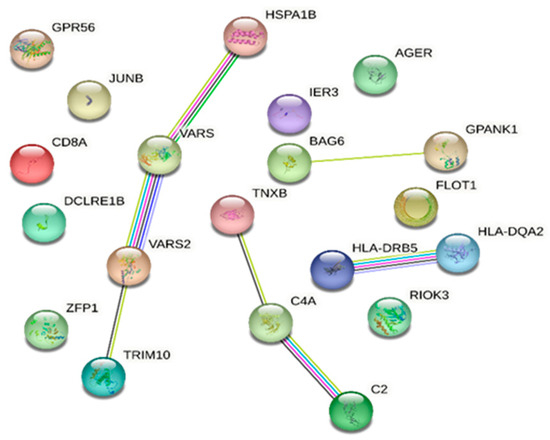 The STRING database analysis of genes associated with DR and in common with DM showed that C2, JUNB, RIOK3, HLA-DQA2, HLA-DRB5, AGER, HSPA1B, BAG6, CD8A, C4A, and TRIM10 are linked with the immune system process (Gene Ontology) with an FDR of 0.0198. Moreover, VARS2 and VARS1 are associated with valyl-tRNA aminoacylation (FDR 0.0197) (Figure 2).