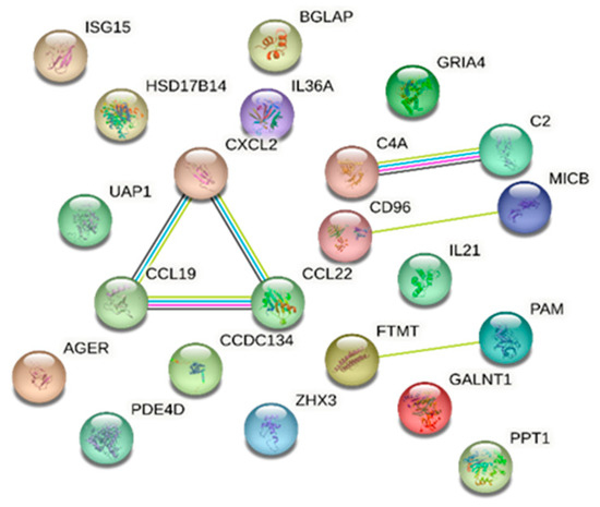Protein analysis using the STRING database identified proteins involved in a number of biological processes with known or potential pathogenicity in DR/DM. Notably, the immune response emerged prominently; 13 proteins were identified that are significantly associated with this process: ubiquitin-like protein ISG15, cAMP-specific 3′,5′-cyclic phosphodiesterase 4D, T-cell surface protein tactile, interleukin-21, MHC class I polypeptide-related sequence B, interleukin-36 alpha, C-C motif chemokine 19, C-C motif chemokine 22, complement C4, advanced glycosylation end-product-specific receptor, complement C2, GRO-beta, and coiled-coil domain-containing protein 134, with an FDR of 0.00043. Our analysis also identified C-C motif chemokine 19, C-C motif chemokine 22, GRO-beta, interleukin-36 alpha, and interleukin-21 as being concurrently linked to cytokine activity molecular function with an FDR of 0.0143. Furthermore, the STRING database analysis reported the association between complement C2 and complement C4 with the activation of C3 and C5 based on Reactome pathways (FDR of 0.0152) (Figure 3).