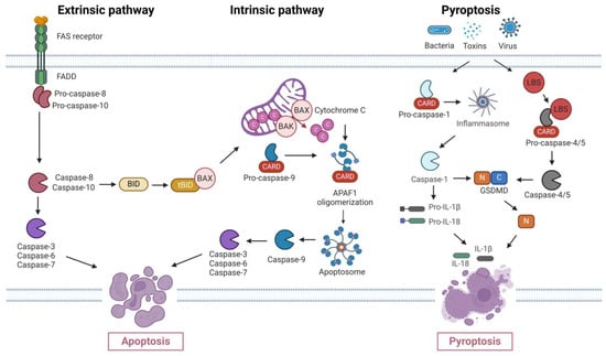 Caspase activation occurs through two primary pathways: the extrinsic and intrinsic pathways (Figure 2) [,]. The intrinsic pathway is centered around forming a complex between APAF-1 and cytochrome c, which regulates the activation of procaspase-9 and ultimately leads to the activation of downstream caspases []. Conversely, the extrinsic pathway is activated by an external signal that interacts with surface death receptors like Fas and tumor necrosis factor (TNF) receptors. This activation leads to the initiation of caspase-8, which can subsequently activate other caspases or induce the release of cytochrome c from the mitochondria into the cytoplasm []. In the intrinsic pathway, a well-defined hierarchy exists, wherein caspase-9 undertakes the processing and activation of effector caspases, including caspase-3 and -7. These activated effector caspases then proceed to process other caspases in a sequential manner []. The complex interaction of caspases in both pathways is impacted by a variety of proteins, such as a group of proteins referred to as inhibitors of apoptosis (IAP) [,].