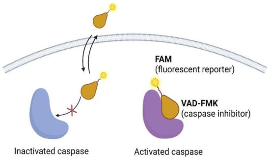 In this instance, Jayaraman and Lee reported two notable investigations on FLICAs for caspase detection []. Jayaraman’s research primarily focused on flow cytometry-based methods, while Lee demonstrated the applications of FLICAs for both in vitro and in vivo apoptosis detection. These FLICAs bind irreversibly to active caspases and are associated with a noticeable change in their fluorescence properties. As a result, caspase activation can be visualized with exceptional temporal resolution at the individual cell level []. However, caution has been raised on the specificity of FLICAs in detecting caspase activation by Pożarowski [], Berger [], and Darżynkiewicz []. Despite this concern, Grabarek [] and Darzynkiewicz [] successfully demonstrated the rapid and accurate detection of apoptotic cells with FLICAs, highlighting their utility in caspase studies. The utilization of FLICAs has been expanded to encompass high-content screening for identifying regulators in the apoptotic machinery []. Moreover, FLICAs have been employed for investigating the intracellular localization of caspases to help establish a correlation between their activation, cell cycle position, and other cellular attributes that otherwise would require cellular permeabilization for measurement []. The continuous advancement in FLICAs highlights their utility and adaptability for detecting caspase activity in laboratory and living organisms. Although the use of FLICAs is an effective method for detecting apoptosis without causing cell toxicity, it has been reported that the FMK group within FLICAs can interact with intracellular protein thiol groups, reducing its specificity [,,].