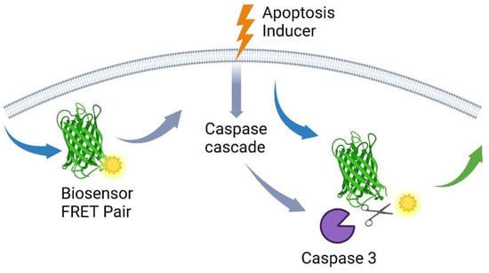Another two innovative homogenous assays of improved sensitivity that are worth mentioning and have been used in detecting the activities of caspase-3 and 7 are the Lanthanide Chelate Excitation (LANCE) and homogeneous time-resolved FRET assays. The LANCE method utilizes a luminescent europium chelate-labeled cleavable peptide combined with a quencher. The peptide cleavage liberates the europium chelate from the quencher, allowing it to resume its fluorescence properties. This design ensures enhanced sensitivity and improved specificity in detecting caspase-3 activity []. On the other hand, the homogeneous time-resolved FRET assay uses a double-tagged caspase substrate carrying an energy donor and acceptor to help resolve fluorescence emitted through energy transfer with time (Figure 5) []. However, the assay can cause a cross-talk between the two FRET probes. This issue can be resolved by a novel ratiometric protease sensor developed for caspase-3 using a single enhanced green fluorescent protein (EGFP) molecule. This innovative approach takes advantage of EGFP’s remarkable resistance to proteases and strategically positions a caspase-3-specific cleavable linker at a sensitive loop location (Glu172) near the EGFP chromophore. The sensor could detect caspase-3 activation or inhibition in cell-based systems and identify the early stages of apoptosis with no interferences from the background expression level [].