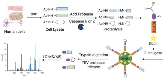 - Luo, S.Y.; Araya, L.E.; Julien, O. Protease Substrate Identification Using N-terminomics. ACS Chem. Biol. 2019, 14, 2361–2371. [Google Scholar] [CrossRef] [PubMed]