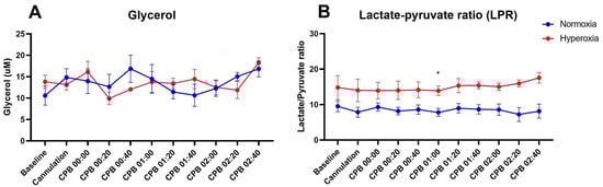 Increasing glycerol levels in cerebral microdialysate indicate brain tissue injury [8]. A rising lactate-to-pyruvate ratio indicates a shift toward anaerobic glycolysis. Ratio values of 17–27 have been previously reported as normal [9,10] and values > 30 have been associated with poor outcomes in human studies [11,12]. There was no difference between groups in the concentration of glycerol in cerebral interstitial fluid at baseline or during CPB (p > 0.7, Figure 1A). As shown in Figure 1B, mean LPR was slightly higher in the hyperoxia group compared with the normoxia group at baseline and throughout the experiment, but this trend only reached significance at 1 h of CPB (p < 0.01, Figure 1B). That being said, LPR in the hyperoxia group never exceeded 30, which is generally the threshold of negative clinical outcomes [11,12].