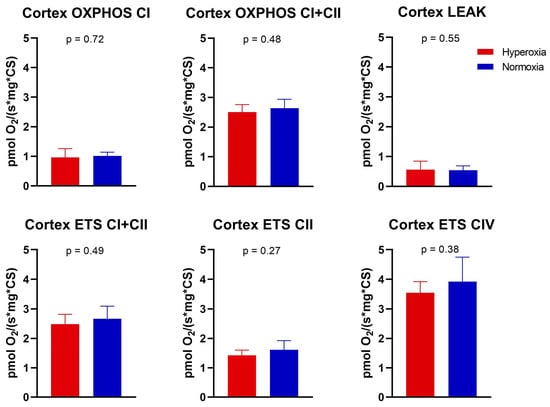 Mitochondrial respiration. Oxygen consumption rates for the six respiratory states measured by high-resolution respirometry. Values were normalized to the citrate synthase activity. There was no difference between the hyperoxia and normoxia groups for any state. Values are plotted as mean and standard error of the mean. The means were compared by one-way ANOVA or Kruskal−Wallis test.