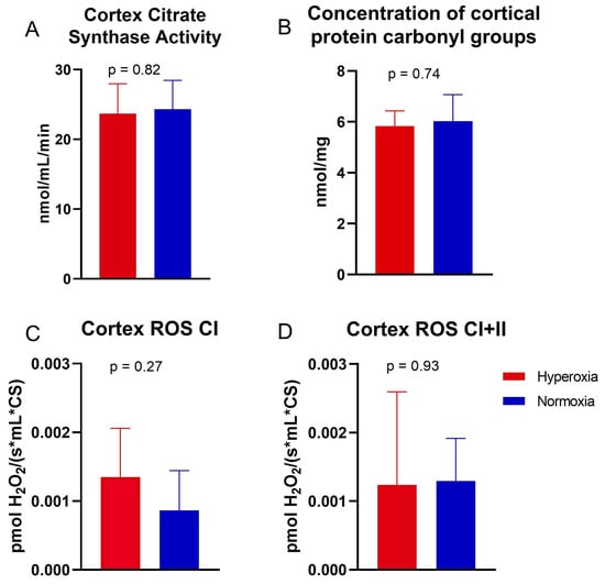 The following respiratory states of the electron transport chain were measured: maximal oxidative phosphorylation via complex I (OXPHOS CI), maximal convergent oxidative phosphorylation via complexes I and II (OXPHOS CI+CII), oligomycin-induced proton cycling through mitochondria without ATP synthesis (LEAK), maximal convergent non-phosphorylating respiration of the electron transport system via complexes I and II (ETS CI+CII), and via complex II alone (ETS CII), and complex IV activity. The cortical mitochondrial respiration via each respiratory state tested was not different between the two groups (Figure 2). There was no difference in OXPHOS CI (p = 0.72), OXPHOS CI+CII (p = 0.48), LEAK (p = 0.55), ETS CI+CII (p = 0.49), ETS CII (p = 0.27), or complex IV activity (p = 0.38). There was no difference in citrate synthase activity (p = 0.82, Figure 3A), or the concentration of oxidized cortical protein carbonyl groups (p = 0.74, Figure 3B) between groups. The cortical ROS levels at OXPHOS CI and OXPHOS CI+CII also did not differ between groups (p = 0.27 and 0.93, respectively, Figure 3C,D).
