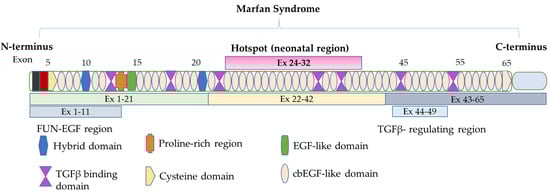 The gene encoding fibrillin-1 (FBN1: MIM:134797) encompasses 65 exons covering 200 kb of genomic DNA which is located on chromosome 15q21.1. Fibrillin-1 contains 47 motifs similar to the human epidermal growth factor (EGF) []. A total of 43 of these 47 EGF-like motifs present a consensus sequence for calcium binding (cbEGF) []. Each motif is composed of six cysteine residues that form disulfide bonds between C1 and C3, C2 and C4, and C5 and C6 which provides stability for its three-dimensional structure [,] (Figure 1). The calcium binding to cbEGF domains offers fibrillin-1 enhanced stability, protection against proteolysis, and structural elements for communication with numerous constituents of the ECM [,]. Wide stretches of these calcium-binding EGF-like motifs are disrupted by some important domains comprising seven of these motifs, with similarity to the latent transforming growth factor β1 binding protein (LTBP) [].