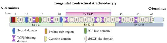 Fibrillins are large cysteine-rich glycoproteins that are major constituents of the extracellular matrix (ECM) that merge into microfibrils []. The fibrillin microfibrils are extensible polymers that provide connective tissue elasticity and are extensively spread in tissues and organs. They serve as templates for elastin deposition during elastic fiber formation and are essential for maintaining the integrity of tissues such as blood vessels, lungs, skin, and ocular ligaments [,,]. The presence of a small proline-rich domain in fibrillin-1 that is replaced by a glycine-rich domain in fibrillin-2 is the main difference between fibrillin-1 and fibrillin-2 []. Nevertheless, the significance of these domains in matrix assembly is obscure and each fibrillin protein is encoded by a specific gene []. The proteins encoded by the two fibrillin genes, FBN1 and FBN2, respectively, share 71.2% similarity but may play distinct significant roles in the formation of the ECM that may underlie varying phenotypic expressions (Table 1) [,].