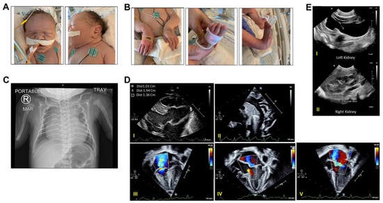 Proband A was born at an outside hospital to a 31-year-old G4P3014 Hispanic mother, weighing 3780 g after a gestation period of 39 weeks. The patient’s prenatal history is significant for premature atrial contractions (PACs) as well as left-sided ureterohydronephrosis. The infant was born via a scheduled repeat low transverse caesarean section and Apgar scores were 3 and 7 at 1 and 5 min of life, respectively. Initially, he was hypotonic with no cry and a heart rate of approximately 100 bpm. Despite initial resuscitation with continuous positive airway pressure (CPAP) up to 100% oxygen supplement, the infant continued to have weak tone, flexed posture, and desaturations with a weak muffled cry. He also had a loud 4/6 holosystolic and a diastolic murmur with a palpable thrill. The remainder of his physical examination was notable for dusky color, skin rash, macrocephaly, folded and creased ears, clenched jaw, long thin fingers, clenched hands, flexed body posture, lack of creases on palms and soles, long thin feet and toes, and abnormal shape of the rib cage (Figure 3A–C).