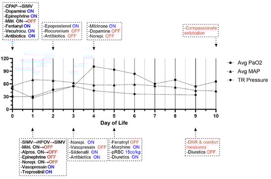 Despite escalating his respiratory support to mechanical ventilation and starting inhaled nitric oxide to reduce pulmonary pressure, he remained hypoxemic with mean oxygen saturation levels around 85%. A repeat echocardiogram on DOL 3 revealed severe tricuspid regurgitation with prolapse, moderate to severe aortic sinus dilatation (Z = +8.1), severe pulmonary sinus dilatation, as well as new mildly diminished left ventricular systolic shortening (Figure 3D). On the abdomen, renal, and bladder ultrasound, he was found to have grade 3 left hydronephrosis without hydroureter according to the Society of Fetal Urology (SFU) classification (Figure 3E). His PPHN was refractory to prostacyclins (Treprostinil, Epoprostenol), and Sildenafil. Despite maximal medical therapy, he continued to have desaturations and hypotension. Per his parents’ request, his care was redirected toward the patient’s comfort care. On DOL 10, he expired after compassionate extubation per parental request. A summary of the clinical course of proband A is shown in Figure 4.
