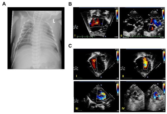 Clinical features of proband B. (A) Representative chest X-ray on day of life 0 (DOL 0) showing cardiomegaly. L: Left. (B) Representative echocardiography images on DOL 0. (I) Color Doppler image across the intra-atrial communication after atrial balloon septoplasty; (II) Color Doppler image showing patent ductus arteriosus. (C) Representative echocardiography images on DOL 6. (I,II) Color Doppler images across the tricuspid valve (I) and the mitral valve (II); (III) Color Doppler image of aortic arch after arterial switch operation; (IV) B-mode and color doppler images of branch pulmonary arteries after arterial switch operation.