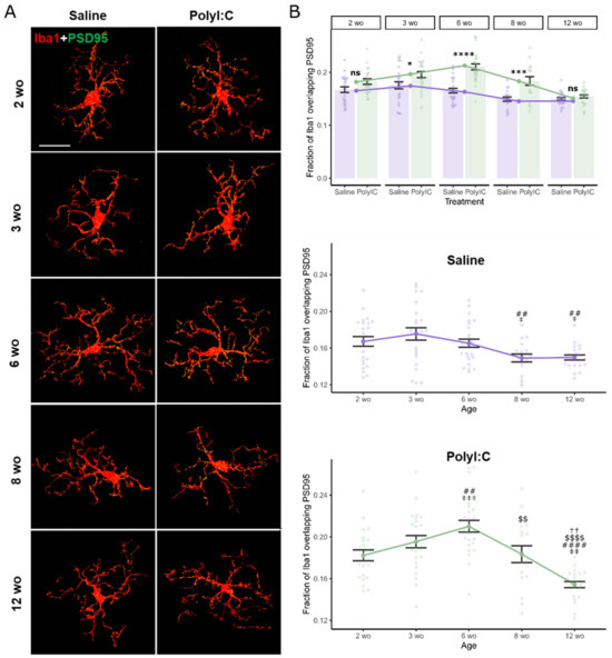 Maternal immune activation increased microglia–synapse overlap in an age-dependent manner. (A) Representative confocal images of antibody staining against microglia marker Iba1 (red) and synapse marker PSD95 (green) in offspring of saline- or polyI:C-treated dams at 2, 3, 6, 8, and 12 weeks of age (wo). Scale bar, 20 µm. (B) Quantification of the fraction of Iba1 overlapping PSD95 (number of views analyzed: saline: 2 wo n = 24, 3 wo n = 24, 6 wo n = 25, 8 wo n = 18, 12 wo n = 22; PolyIC: 2 wo n = 22, 3 wo n = 24, 6 wo n = 32, 8 wo n = 17, 12 wo n = 23; from n = 2–3 mice in each group). Treatment-effect comparison indicated as * relative to saline group, separate trend-lines for each treatment across age are shown below, ‡ relative to 2 wo, # relative to 3 wo, $ relative to 6 wo, † relative to 8 wo. Error bars represent the mean ± SEM, two-way aligned-ranks ANOVA, fdr-corrected post hoc marginal means, ns-not significant, *, ‡ p < 0.05, ‡‡, ##, $$, †† p < 0.01, ***, ‡‡‡ p < 0.001, ****, ####, $$$$ p < 0.0001. Raw data tables are contained in Supplementary File S1.