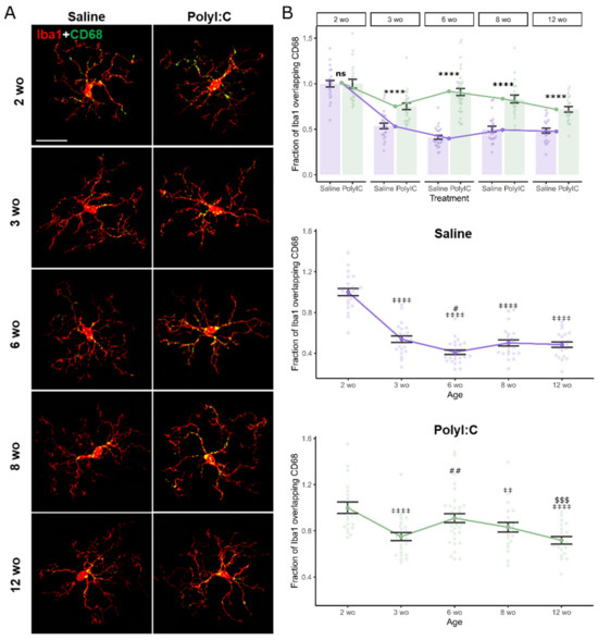 Maternal immune activation increased expression of the microglia phagocytosis marker CD68 in an age-dependent manner. (A) Representative confocal images of antibody staining against microglia marker Iba1 (red) and phagocytosis marker CD68 (green) in offspring of saline- or polyI:C-treated dams at 2, 3, 6, 8, and 12 weeks of age (wo). Scale bar, 20 µm. (B) Quantification of the fraction of Iba1 overlapping CD68 (number of views analyzed: saline: 2 wo n = 23, 3 wo n = 23, 6 wo n = 25, 8 wo n = 23, 12 wo n = 22; PolyIC: 2 wo n = 20, 3 wo n = 23, 6 wo n = 33, 8 wo n = 22, 12 wo n = 20; from n = 2–3 mice in each group). Treatment-effect comparison indicated as * relative to saline group, and separate trend-lines for each treatment across age are shown below, ‡ relative to 2 wo, # relative to 3 wo, $ relative to 6 wo. Error bars represent the mean ± SEM, two-way ANOVA, fdr-corrected post hoc marginal means, ns-not significant, # p < 0.05, ‡‡, ## p < 0.01, $$$ p < 0.001, ****, ‡‡‡‡ p < 0.0001. Raw data tables are contained in Supplementary File S1.