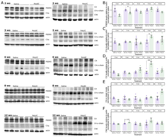 Maternal immune activation affects PSD95, and complement C1q and C4 protein expression in an age-dependent manner. Protein levels were measured in offspring of saline- or polyI:C-treated dams at 2, 3, 6, 8, and 12 weeks of age (wo). (A) Representative Western blots (saline: 2 wo n = 5, 3 wo n = 4, 6 wo n = 4, 8 wo n = 5, 12 wo n = 4; PolyIC: 2 wo n = 3, 3 wo n = 4, 6 wo n = 4, 8 wo n = 5, 12 wo n = 4). (B) Densitometry analysis of PSD95 protein levels. (C) Densitometry analysis of complement C1q protein levels. (D) Densitometry analysis of complement C4 levels. (E) Densitometry analysis of C4 α-chain levels. (F) Densitometry analysis of complement C4d levels. Protein levels are expressed relative to actin and normalized to the mean levels in the saline control group for each age. Error bars represent the mean ± SEM, * p < 0.05, ** p < 0.01, Holm-corrected Welch’s t-tests. Raw data tables, raw Western blot images, and annotated summary file of Western blot images are contained in Supplementary File S1.