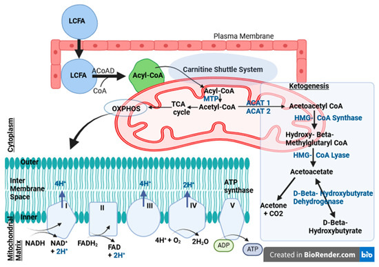 β-oxidation of FAs, Ketogenesis, and OXPHOS. Upon entering the cell, LCFA undergoes activation by binding with CoA. The initial reaction is catalyzed by ACoAD. This transformed molecule, now an acyl-CoA, is transported across the mitochondrial membrane through the carnitine shuttle system. The long-chain acyl-CoA produced is subsequently oxidized to generate acetyl-CoA, a process facilitated by MTP. Created in BioRender.