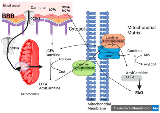 The balance of carnitine homeostasis is maintained by a harmonious interplay of dietary absorption, endogenous biosynthesis, and efficient renal reabsorption. The brain does not directly use FAs for oxidative metabolism. Instead, it relies on KBs derived from acetyl-CoA and acetoacetyl-CoA, which are generated via FAO that occurs mainly in the liver [12,38,53,62].