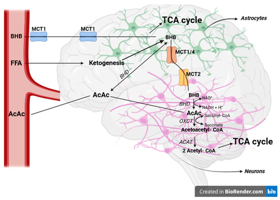Astrocytes express MCT4, which, similar to MCT1, has a relatively low affinity for BHB. In contrast, neurons predominantly express the MCT2 isoform, characterized by a high affinity for BHB. The effect of KBs on neurons could still be mediated by neuronal uptake. MCT2 expression in neurons is co-localized in mitochondria-rich postsynaptic density structures, suggesting its potential role in synaptic transmission. This implies that both neurons and, to some extent, astrocytes have the capacity to take up KBs (Figure 3) [8,90,91,92].
