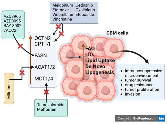 Analysis of metabolic profiles between low-grade gliomas (LGG) and patient-derived GBM revealed a prevalence of FA catabolism over synthesis in GBM. This observation demonstrates the dual nature of β-oxidation, which encompasses both anabolic and catabolic functions, providing metabolic plasticity to GBM cells, which allows tumor cells to adapt and grow in different microenvironmental conditions [103,104].