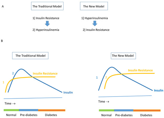 (A) In the traditional model, it was thought that insulin resistance preceded and led to hyperinsulinemia. In this model, hyperinsulinemia followed insulin resistance. In the new model, hyperinsulinemia is the triggering event and precedes insulin resistance. (B) In the traditional model, insulin resistance already started before the development of impaired glucose tolerance and type 2 diabetes. With time, the β-cell progressively lost its function. As a result, insulin secretion decreased, and frank type 2 diabetes developed. In the new model, hyperinsulinemia precedes insulin resistance. Hyperinsulinemia-induced insulin resistance develops during the conversion from normoglycemia to prediabetes. When with time the β-cell progressively loses its function, frank type 2 diabetes develops. Reproduced from [6].