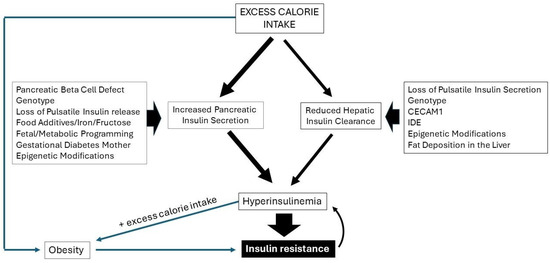 Factors involved in hyperinsulinemia and insulin resistance. Excess calorie intake may induce increased pancreatic insulin and/or a reduced hepatic insulin clearance. Hyperinsulinemia may be responsible for the development of insulin resistance and obesity. Obesity is also a consequence of excessive calorie intake. Obesity may further deteriorate insulin resistance, and this may further increase hyperinsulinemia. Pancreatic beta cell defects, certain genotypes, the loss of pulsatile insulin secretion, food additives, fructose, iron, gestational diabetes from the mother, epigenetic modifications and fat accumulation in the pancreas may play a pathogenetic role in increased pancreatic insulin secretion. The loss of pulsatile insulin secretion, certain genotypes (in particular CECAM1 and IDE), epigenetic modifications and fat accumulation in the liver may play a pathogenetic role in reduced hepatic insulin clearance.