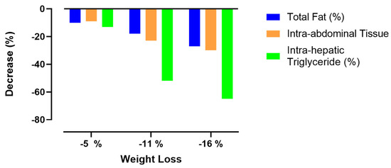 Effects of progressive weight loss (−5%, −11% and −16%) on fat content of total fat, intra-abdominal tissue and intrahepatic triglyceride (compared to baseline; (n = 9) *). After 16% weight loss, relative decrease in intrahepatic fat content was greater than relative decrease in intra-abdominal and total (subcutaneous) body fat content, whereas after 5% weight loss, there were no clear differences in loss of fat content between these three compartments. Fat content was measured as percentage via MRI. * Modified from [145].