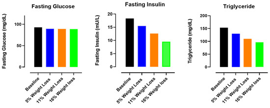 Effects of progressive weight loss (−5%, −11% and −16%) on fasting glucose, fasting insulin and triglyceride levels compared to baseline (n = 9) *. With progressive weight loss, fasting insulin and triglyceride levels significantly decreased, whereas fasting glucose did not change during increasing weight loss, suggesting improvement in hepatic insulin sensitivity. * Modified from [145].