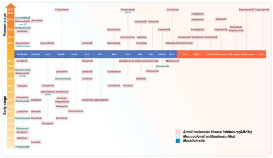 Several articles have extensively discussed FDA- or globally approved kinase inhibitors [5,7,80]. Roskoski et al. have been summarizing the physicochemical properties of FDA-approved kinase inhibitors, including lipophilic efficiency and ligand efficiency, since 2019 [28,37,81,82,83,84]. In addition, there are websites regularly updating approved or clinically tested kinase inhibitors (https://brimr.org/protein-kinase-inhibitors/; https://www.icoa.fr/pkidb/, accessed on 1 March 2024). For SMKIs approved by the FDA between 2018 and 1 March 2024, we provide a summary based on timelines and targets in Figure 2. Our analysis primarily focuses on targets or mutants that were previously unapproved, including TRK, FGFRs, CSF-1R, and AKT, among others. Furthermore, we further elucidate the resistant mutations and mechanisms of these approved targets.