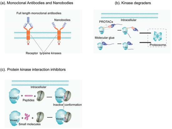 New strategies for targeting kinases include kinase degraders and protein kinase interactors. Kinase degraders encompass proteolysis-targeting chimeras (PROTACs), lysosome-targeting chimeras (LYTACs), dTAGs, hydrophobic tagging, and “Trim-Away” technologies. On the other hand, protein kinase interactors build upon the concept of protein–protein interaction (PPI) inhibitors, mainly disrupting the interaction between kinases and substrates without affecting enzymatic activity [18]. Peptides are considered promising candidates for protein kinase interactors due to their more flexible conformations and higher selectivity [19]. These emerging strategies show promise in developing new targets and overcoming drug-resistant mutations, with some already progressing to clinical trials.