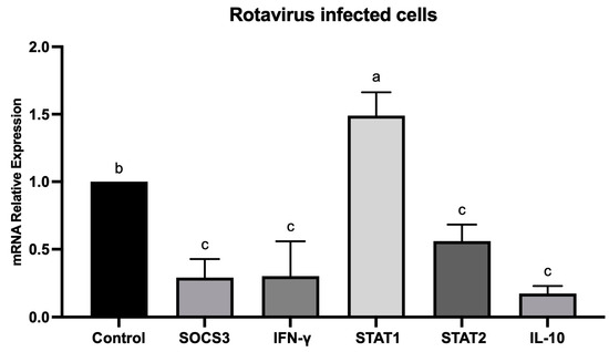 Rotavirus (RV)-infected cell assays. Relative expression level of SOCS3, IFN-γ, STAT1, STAT2, and IL-10 genes in HT-29 cells infected with rotavirus using uninfected HT-29 as the control. Data were analyzed by ANOVA with subsequent Tukey test using GraphPad Prism 10. Different letters indicate statistical significance between treatments. p values < 0.05 were considered statistically significant.