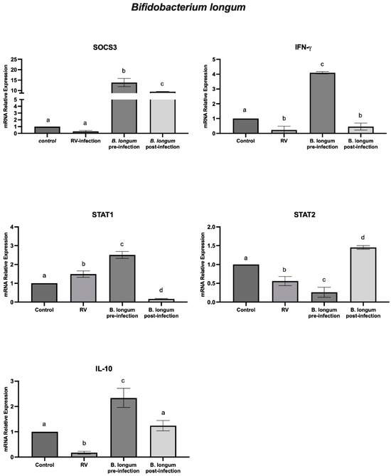 B. longum and rotavirus (RV) assays. The relative expression levels of SOCS3, IFN-γ, STAT1, STAT2, and IL-10 genes in HT-29 cells treated with B. longum before (pre-infection) and after (post-infection) rotavirus infection were analyzed by ANOVA with subsequent Tukey test using GraphPad Prism 10. Different letters indicate statistical significance between treatments. p values < 0.05 were considered statistically significant.