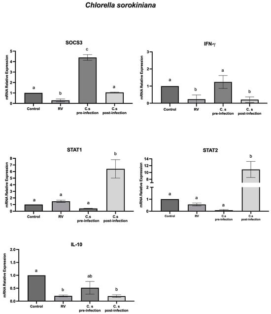 B. longum in combination with C. sorokiniana and rotavirus (RV) assays. The relative expression level of SOCS3, IFN-γ, STAT1, STAT2, and IL-10 genes in HT-29 cells treated with B. longum and C. sorokiniana before (pre-infection) and after (post-infection) rotavirus infection. Data were analyzed by ANOVA with subsequent Tukey test using GraphPad Prism 10. Different letters indicate statistical significance between treatments. p values < 0.05 were considered statistically significant.