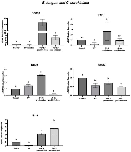 C. sorokiniana and rotavirus (RV) assays. The relative expression level of SOCS3, IFN-γ, STAT1, STAT2, and IL-10 genes in HT-29 cells treated with B. longum before (pre-infection) and after (post-infection) rotavirus infection. Data were analyzed by ANOVA with subsequent Tukey test using GraphPad Prism 10. Different letters indicate statistical significance between treatments. p values < 0.05 were considered statistically significant.