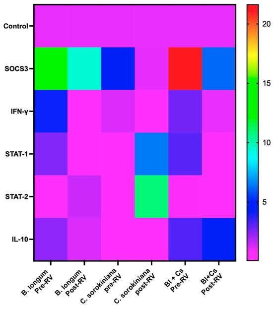 Heat map showing the mRNA expression of SOCS3, IFN-γ, STAT-1, STAT-2, and IL-10 in B. longum pre-infected with rotavirus (pre-RV): HT-29 cells infected with RV and treated with B. longum (Bl); B. longum post-infected with RV (post-RV): HT-29 cells treated with Bl and infected with RV; C. sorokiniana pre-RV: HT-29 cells infected with RV and treated with C. sorokiniana (Cs); C. sorokiniana post-RV: HT-29 cells treated with Cs and infected with RV; Bl + Cs pre-RV: HT-29 cells treated with B. longum in combination with C. sorokiniana and then infected with RV; Bl + Cs post-RV: HT-29 cells infected with RV and treated with B. longum in combination with C. sorokiniana. Data were analyzed by three-way ANOVA with subsequent Tukey test using GraphPad Prism 10.