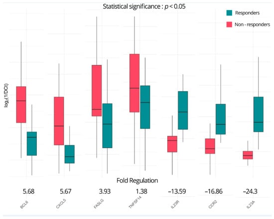 As described in our methodology, a DGEA was performed for gene expression at baseline for the two sample groupings of the responders, who were used as controls, and the non-responders. Only seven genes, as presented in Figure 1, effectively achieved p < 0.05 due to what appears to be a high level of variability. In the non-responders, B-cell lymphoma 6 (BCL6), C-X-C motif chemokine ligand 5 (CXCL5), and Fas ligand (FASLG) show positive fold upregulations of 5.68, 5.67, and 3.93, respectively. Tumor necrosis factor ligand superfamily member 14 (TNFSF14), while achieving statistical significance, displays a modest upregulation of just 1.38-fold. On the other hand, interleukin-23 receptor (IL23R), C-C chemokine receptor type 2 (CCR2), and interleukin-23 subunit alpha (IL23A) are significantly downregulated with fold regulations of −13.59, −16.86, and −24.3, respectively. While these seven genes provide strong indications of their ability to serve as predictive biomarkers, we wanted to expand our investigation to include all genes that present two or more times up- or downregulation to better understand the inflammatory and immunological backgrounds of these patients.