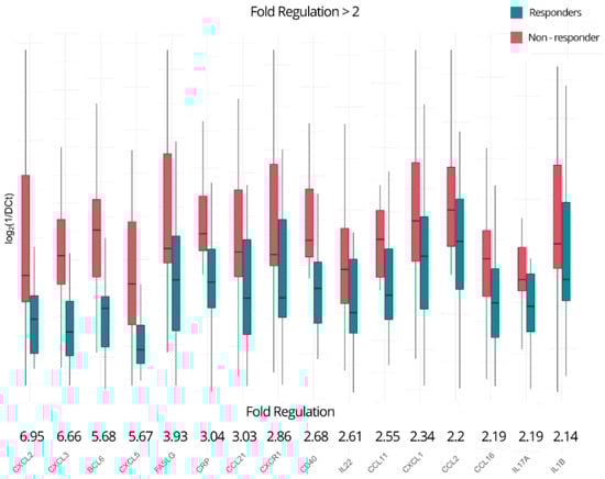 Samples were divided into responders to therapy, used as our control group, and non-responders. Differential gene expression analysis (DGEA) was performed using the RT2 Profiler PCR Array Data Analysis software (version 3.5) from Qiagen. All samples met the quality criteria for PCR array reproducibility, RT efficiency, and absence of genomic DNA contamination. In brief, for within-sample normalization, the 2−ΔCt method was applied using five housekeeping genes (ACTB, B2M, GAPDH, HPRT1, and RPLP0). Fold change (FC) was determined by the 2−ΔΔCt method and is reported as the fold regulation in the results, which is more biologically relevant (genes exhibiting under-expression are denoted as the negative reciprocal of the fold change, while overexpressed genes are presented as the fold change). The statistical significance was assessed through Student’s t-tests conducted on the replicate 2−ΔCt values for each gene in both responders’ and non-responders’ groups. All results were investigated based either on their statistical significance (p < 0.05) or on their fold regulation thresholds of <−2 or >2 (non-responders versus responders). DGEA plots were created in R v. 4.3.0 [] for which log2(1/ΔCt) values were employed to normalize and highlight expression differences using the ggplot2 [] package.