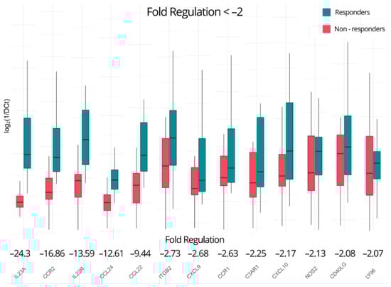 In total, 29 out of the 84 investigated genes appear to be dysregulated using the aforementioned criteria, including six of the seven statistically significant genes. In detail, C-X-C motif chemokine ligand 2 (CXCL2) and C-X-C motif chemokine ligand 3 (CXCL3) show the highest positive fold regulations of 6.95- and 6.66-fold, respectively, indicating significant perturbation in the non-responders. BCL6, CXCL5, FASLG, C-reactive protein (CRP), C-C motif chemokine ligand 21 (CCL21), C-X-C motif chemokine receptor 1 (CXCR1), CD40 molecule (CD40), interleukin-22 (IL22), C-C motif chemokine ligand 11 (CCL11), C-X-C motif chemokine ligand 1 (CXCL1), C-C motif chemokine ligand 2 (CCL2), C-C motif chemokine ligand 16 (CCL16), interleukin-17A (IL17A), and interleukin-1 beta (IL1B) also show expression upregulations ranging from 2.14- to 5.68-fold (Figure 2). As for the downregulated genes (Figure 3), lymphocyte antigen 96 (LY96), CD40 ligand (CD40LG), nitric oxide synthase 2 (NOS2), C-X-C motif chemokine ligand 10 (CXCL10), complement C3a receptor 1 (C3AR1), C-C motif chemokine receptor 1 (CCR1), C-X-C motif chemokine ligand 9 (CXCL9), integrin subunit beta 2 (ITGB2), C-C motif chemokine ligand 22 (CCL22), C-C motif chemokine ligand 24 (CCL24), IL23R, CCR2, and IL23A are downregulated, ranging from −2.07-fold to an impressive −24.3-fold, as previously noted. A summary of all the up- and downregulated genes in the non-responders with a fold regulation of at least ±two-fold is presented in Table 1.