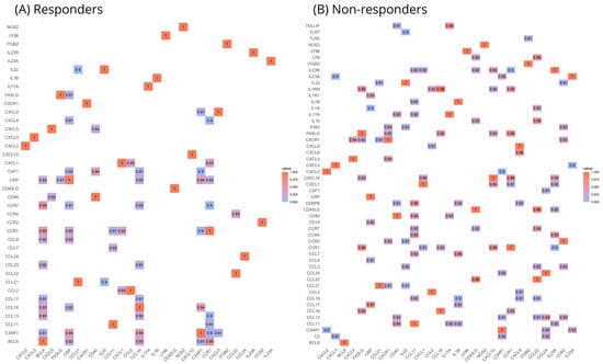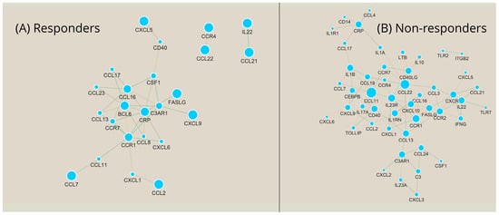 To help us explore all the correlations further and quantify the gene significance within each group, we constructed co-expression networks (Figure 5) and applied graph analysis metrics to them. In the responders’ group, BCL6 and CRP are highlighted as the most important hubs with a degree centrality (DC) of 9, followed by CCR1 and CCL16 (DC = 8), C3AR1 (DC = 6), and CCR7 and CSF1 (DC = 4). The results of betweenness centrality (BC) highlighted a number of genes as important mediators of the network. In ascending order, the top 10 are CCR1, CRP, CSF1, BCL6, C3AR1, CCL16, CCL11, CD40, CXCL1, and CCR7 with respective BC values of 0.41, 0.27, 0.20, 0.17, 0.16, 0.12, 0.11, 0.11, 0.11, and 0.01. For the non-responders, the network, as expected from the corresponding correlation results, is much more complex. Interestingly, the top two hubs highlighted by this approach, CCL11 (DC = 9) and CCL22 (DC = 8), were not genes with a p < 0.05 dysregulation and showed only a moderate level of upregulation in the non-responders for the former and a moderate level of downregulation for the latter. The rest of the observed hubs include IL23R and CCR1 with DC values = 6; C3AR1, CRP, IL22, IL1B, CXCR1, CD40, CCR2, CCL13, CD40LG, FASLG, IL1RN, and CXCL10 with DC values = 5; and CCL19, CXCL9, CCL24, and CEBPB with DC values of 4. By examining the network bottlenecks based on their BC values, we observe the following genes in the top 10 spots: CCL13 (BC = 0.35), CCL22 (BC =0.33), CCL11 (BC = 0.18), CCR2 (BC =0.16), IL23R (BC = 0.15), CD40 (BC = 0.14), CRP (BC = 0.14), C3AR1 (BC = 0.13), CXCR1 (BC = 0.13), and IL1A (BC = 0.11). Once more, we see CCL11 and CCL22 in these results, which highlights their crucial significance within the network. Studying the results of the two networks side by side, we also find some commonalities, like CRP, CCR1, and C3AR1 as hubs in both and CCR1, CRP, C3AR1, CCL11, and CD40 as shared bottlenecks.