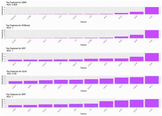 Finally, since our aim is to identify predictive markers to response to treatment, we employed an ML pipeline that enhances the DGEA. ML of gene expression data offers the advantage of uncovering complex patterns and relationships that may not be captured by traditional DGEA methods, allowing for a more nuanced and comprehensive understanding of biological processes while allowing us to see if specific markers can predict response to treatment and performance [,]. Our methodology is based on the h2o v.3.42.0.2 R package [] and employs five different ML models, for which we calculate their area under the curve (AUC) metrics to measure their predictive power in discerning responders and non-responders to ustekinumab therapy. We report the AUCs and top 10 important features (genes) for each of the following algorithms: gradient boosting machine (GBM), XGBoost (eXtreme gradient boosting), extreme random trees (XRT), generalized linear model (GLM), and distributed random forest (DRF). The algorithms were selected for their robustness and previous effectiveness for biological data [,]. All models were trained using a five-fold cross-validation approach on 60% of our available samples (n = 23) and tested on the remaining 40% (n = 13) using datasets containing samples from both responders and non-responders.
