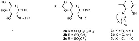 Derivatives of common, simple carbohydrates are not frequently reported among the many different forms of chiral ligands that are accessible. The benefit of sugar derivatives is their modular synthesis, which allows for easy ligand structure modification throughout synthesis, resulting in different ligands possessing the same chiral precursor. We previously reported the synthesis of hydroxy sulfonamides 2 derived from d-glucosamine 1, which were used as ligands in the titanium-promoted additions of diethyl- [,], and alkynylzincs [] to aldehydes (Figure 1).