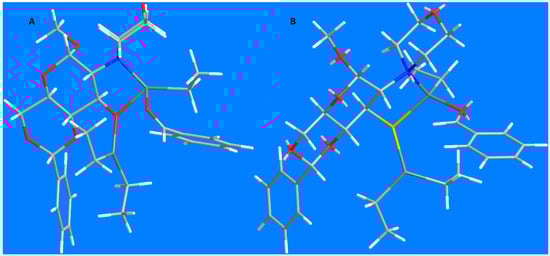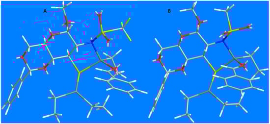 In the case of sulfonamides, the main factor influencing enantiodiscrimination is probably the interaction of the anomeric methoxyl group with the methyl- and trifluoromethylsulfonamide groups in 27 and 31, respectively (Figure 3A,B). The bigger CF3 substituent has to be placed farther from the anomeric OCH3 (Figure 3A) and that allows for the easier rotation of the aldehyde, leading to diminished enantioselectivity. The smaller methanesulfonyl group locates itself in close proximity of the anomeric methoxy (Figure 3B) and hinders the rotation of the carbonyl group, securing higher enantiodiscrimination.