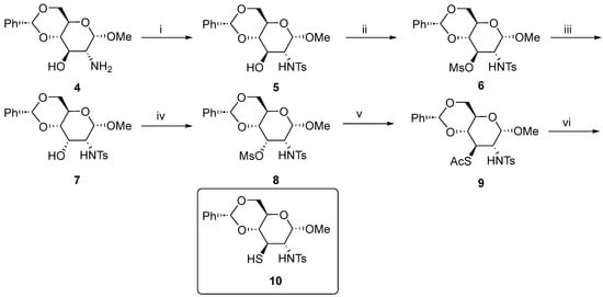 The synthesis of methyl 4,6-O-benzylidene-2,3-dideoxy-3-thio-2-p-toluenesulfonamido-α-d-glucopyranoside 10. Reaction conditions: (i) p-TsCl, Na2CO3, 1,4-dioxane:H2O (1:1), 4 h, 92%; (ii) MsCl, Et3N, DCM. 0 °C to r.t., 3 h, 74%; (iii) NaOAc, 2-methoxyethanol:H2O (10:1), 110 °C, 46 h, 95%; (iv) MsCl, Et3N, DCM. 0 °C to r.t., 3 h, 90%; (v) KSAc, MeCN, 75 °C, 1.5 h, 89%; and (vi) LiAlH4, THF, 0 °C, 4 h, 41%.