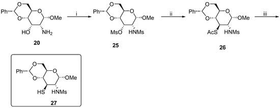 Synthesis of methyl 4,6-O-benzylidene-2,3-dideoxy-2-methanesulfonamido-3-thio-α-d-glucopyranoside 27. Reaction conditions: (i) MsCl, pyridine, 0 °C, 24 h 75%; (ii) KSAc, DMPU, 100 °C, 6 h, 60%; and (iii) LiAlH4, 0 °C to r.t., 4 h, 65%.