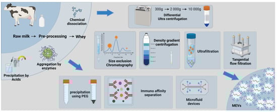 Around 80% of the total protein in raw milk are caseins that form micelles with spherical shapes and size ranges overlapping with EVs. Physical and chemical pre-processing steps have been identified to remove caseins by centrifugation, acid precipitation, chelation with calcium ions, and aggregation by enzymatic treatments. However, these chemical treatments might have effects on MEV membranes and their downstream applications [,,]. The most commonly used EV isolation techniques are depicted in Figure 1.