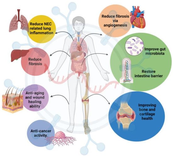 MEVs have been proven to improve intestinal health, specifically during necrotizing enterocolitis (NEC), a fatal disease for premature infants. Recently, it has been demonstrated that MEVs exert a prophylactic effect on the NEC model in vitro via the induction of goblet cell functions, which are responsible for the mucous production that prevents intestinal injuries []. In addition, parallel studies have revealed that, when orally administered, bovine MEVs can reduce NEC-related lung injuries via the regulation of the NF-κB signaling pathway, eventually reducing inflammatory factors [].